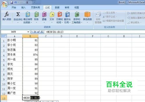 然后按下“enter”键,这个时候求最小值的单元格中就显示出这些数字当中的最小值。(如下图)