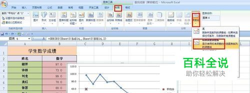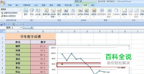 选定“平均分”数据点,选择布局——误差线——其他误差线选项,弹出对话框,选择水平误差线,选择正负偏差,无线端。“误差量”选择自定义,把正误差值=11,负误差值=1,单击确定,单击“线条颜色”,设置为实线,选择一种颜色。单击确定,就可以看到平均分线了。