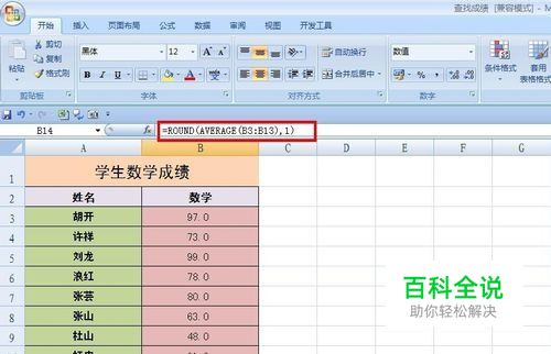 我们先导入一张学生的数学成绩表格,在平均值B14单元格中输入=ROUND(AVERAGE(B3:B13),1)。如图所示。