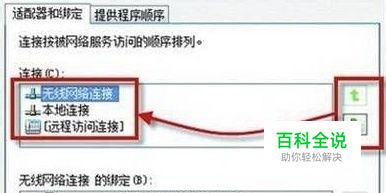 选中本地连接,单击右边的绿色箭头,把本地连接调前到无线网络连接之前,单击确定即可。