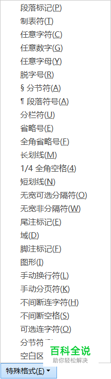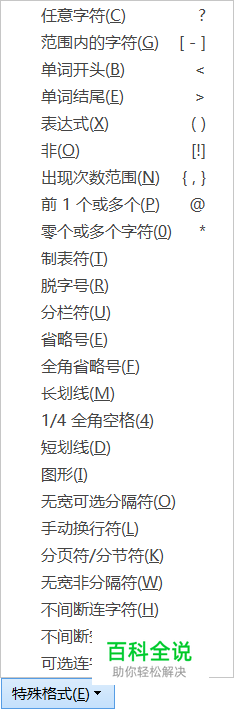 当不勾选“使用通配符”时,“特殊格式”中可查找和替换的格式如图所示: