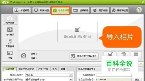 添加相片 数码大师具有本机相册、锁屏相册、礼品包相册、视频相册、网页相册五大功能。今天就以礼品包相册为例,教大家制作小巧精美的电子相册。 我们首先要切换到“礼品包相册”选项卡,以看到礼品包相册最全的参数设置。双击相片列表中部的大按钮,将要制作成电子相册的相片一次性导入。 当然希望每张相片都有独立的标识,为每张相片添加注释和旁白,重新翻阅时,更能勾起无限回忆。点击“修改名字/注释/旁白”按钮,即可为每张照片添加详细的文字说明。在左下角的“名字/注释”和“旁白”处,设置文字说明的属性。