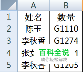 原始数据如下,A列包含重复的姓名,B列是对应的不同数量或者说型号。需要将A列数据去除重复值,并且将B列的同一个人的数量合并在一个单元格里并用逗号分开。