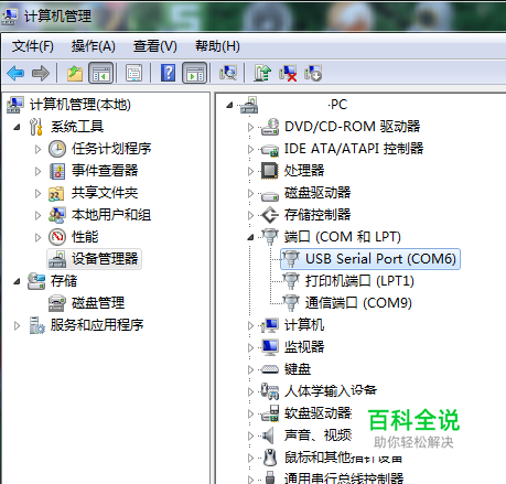 点击设备管理,查看端口中的USB Serial Port,后面的com6就是他的端口号,如果想要修改这个端口号请查看我的另一篇经验,《修改计算机的com端口号》