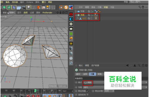 钻石模型的创建这里就不一一述说了,可以参考所给的引用经验。这里用钻石和一个平面型搭建一个简单的场景。 给模型钻石添加一个放射克隆,数量为3,半径为336,平面方向为XZ。并将克隆对象移动到平面的上方。