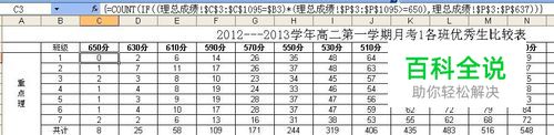 公式的意思是在理总成绩这个工作表中统计一下C3到C1095区域内等于优秀生分数段工作表中B3单元格,并且在理总成绩工作表中P3到P1095区域内大于等于650分的总人数有多少个。(其中$C$3:$C$1095区域放置的是班级名称,$P$3:$P$1095区域放置的是成绩)其他分数段只要把650改一下就可以了。这样就把每个班不同分数段的人数就统计好了。