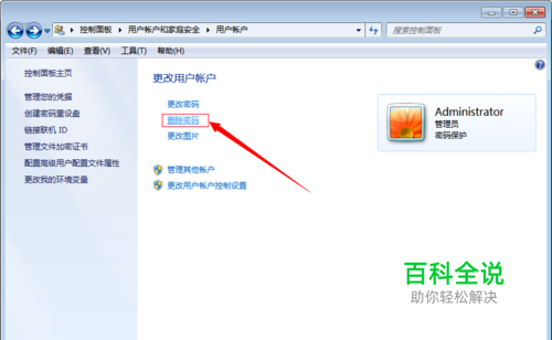使用【设置密码】中的方法打开【用户账户页面】,在用户账户页面点击【删除密码】;