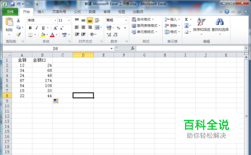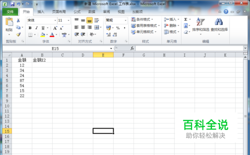 有时候需要将excel文件中的某一列数字加倍后显示在另一列中,为了举例方便,创建了一个示例,如图。第一列为金额,每二列为金额的2倍。