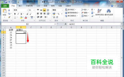 将鼠标箭头指向B2单元格右下角,变成黑色十字后向下拉。这样第二列的值就是第一列金额的2倍了。