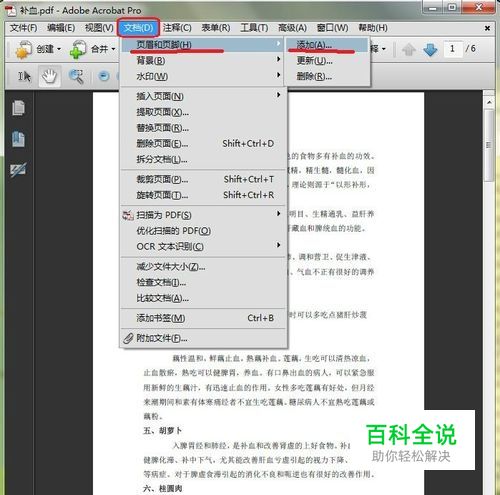 找到主菜单上的“文档”—下拉菜单“页眉和页脚”—子菜单“添加”,点击“添加”后会弹出步骤3中的对话框