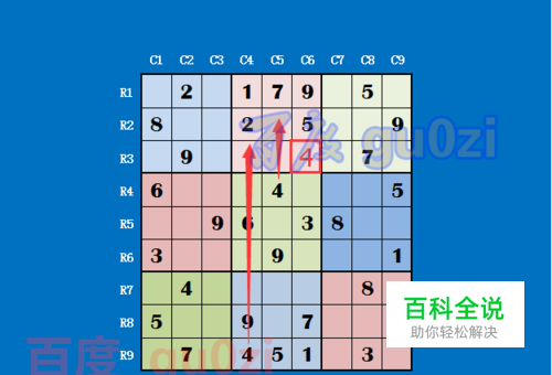 先找一个可以入手的地方开始,从R9C4和R4C5是4,很容易得到R3C6是4,同理得出R3C3为5,