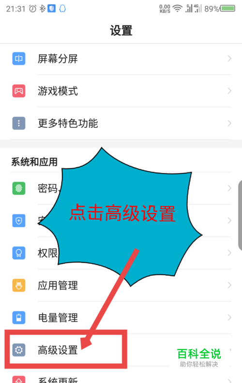 打开手机系统设置后,滑动屏幕找到高级设置选项,一般键盘设置都在高级设置里面,点击高级设置。如图所示