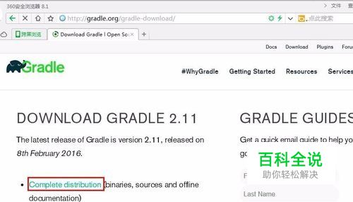到Gradle官网,下载Gradle安装包。 选择“Complete distribution (binaries, sources and offline documentation)”