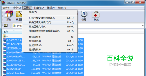 选中要转换格式的这些文件,然后点击“工具”>“转换压缩文件格式”选项。打开“转换压缩文件”对话框。