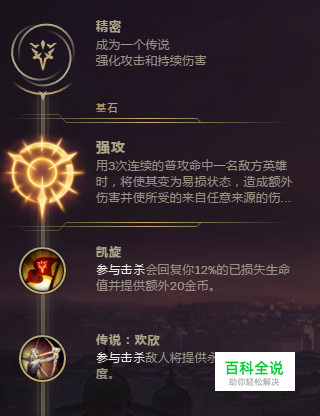 小编选择的是精密系符文,强攻增强剑圣的持续输出伤害,更好的再打团中发挥自己的收割效果。致命一击对生命低的敌方英雄造成更多的伤害。欢欣增加打野gank后自己的攻速。