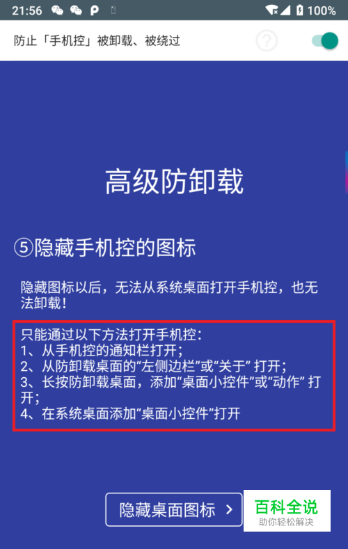高级防卸载:隐藏不做手机控的桌面图标,可以彻底解决从桌面卸载的问题。隐藏图标以后,还可以从通知栏、桌面小控件、防卸载桌面、等多种方式启动手机控。