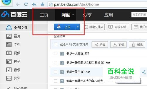 首先上传文件到百度网盘,打开百度网盘,点上面的上传文件。
