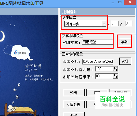 在水印位置那里是添加水印在图片上的显示位置,自己设定一个,这里我选择图片中央,水印文字那里就填入想添加水印的文字,然后再字体中设置各种属性。