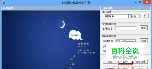 打开软件后,点击打开按钮,选中想要添加水印的图片,然后打开。