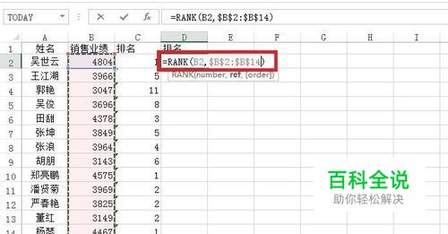 正是基于这种情况,有时候为了知道某数据的具体排位,我们需要用rank函数来计算,在C2单元格中输入公式:=RANK(B2,B2:B14),然后进行填充。
