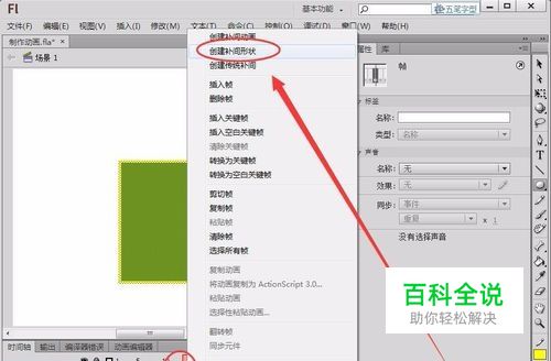 在时间轴的第1帧与30帧之间的任意位置右击,选择“创建补间形状”。