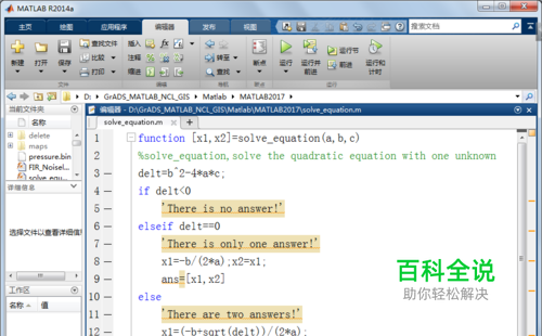 本文主要介绍input( )交互式输入变量(即一元二次方程的系数a,b,c),然后调用同一路径下的函数文件(solve_equation.m)求解一元二次方程的方法。