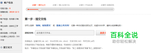 2、点击“提交论文”,点击“选择文件”按钮,在电脑上找到送检文档,点击“下一步”。(系统支持论文批量检测,把待检论文打包成zip或者rar格式的压缩文件后上传,注:单个压缩文件不超过200MB)如图: