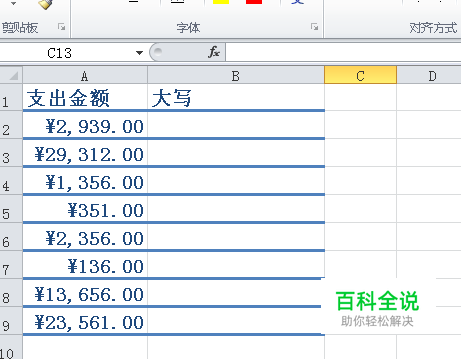 这里我们用到一个电子表格的内置函数TEXT,TEXT 函数可将数值转换为文本,并可使用户通过使用特殊格式字符串来指定显示格式。 接下来,我们在大写这一列输入:=text(a2,"[DBNum2]0")