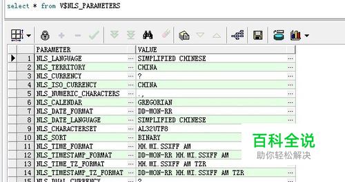 输入sql语句select * from V$NLS_PARAMETERS查看字符集,查看第一行value值是否为简体中文