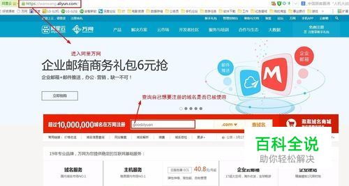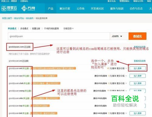 首先,在浏览器上输入万网官网,进入,在首页的域名查询界面查询自己想要注册的域名是否已被使用,如已被使用只能换用其他的域名进行注册~选中一个自己喜欢的域名后进行购买即可