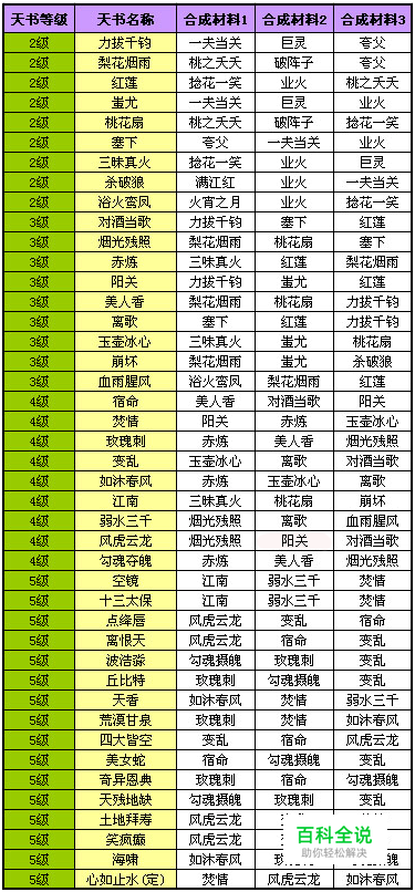 除了 4级天书“江南”是由1个3级天书和2个2级天书合成之外, 其他天书的合成遵循以下规律: 1级任何天书都是用3个天书碎片和4个无字天书合成 2级天书用3个指定1级天书合成 3级天书用3个指定2级天书合成 4级天书用3个指定3级天书合成 5级天书用3个指定4级天书合成