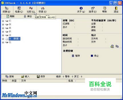 在开始菜单中依次单击“所有程序”→CDCheck→CDCheck菜单项,打开程序主窗口。在左窗格的目录树中选中刻录光盘所在的驱动器,然后单击工具栏中的“比较”按钮,如图2010041658所示。