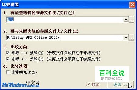 打开“比较设置”窗口中,单击“要检查错误的来源文件夹/文件”选项右侧的浏览按钮,指定待检查的目录或文件,这里默认是前面选择驱动器的盘符。接着单击“要与来源比较的参照文件夹/文件”选项右侧的浏览按钮,指定对照的源文件夹或文件(也就是刻录到光盘中的数据所在的原始目录)。确认设置无误后,单击“继续”按钮开始进行比较操作,如图2010041659所示。