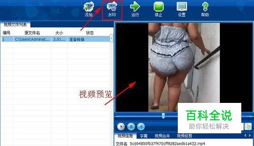 视频素材打开后可以在界面右边进行预览,然后点击“水印”按钮。