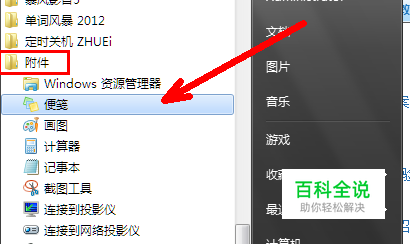 在所有程序中,找到附件文件夹,打开后会发现这个便笺工具。单击鼠标打开。