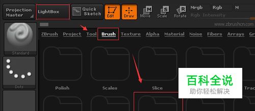 首先找到要增加光滑笔刷强度的具体位置:单击Lightbox[灯箱]按钮,接着在下挂菜单栏中点击Brush[笔刷]菜单,找到Smooth[光滑]文件夹并双击打开。