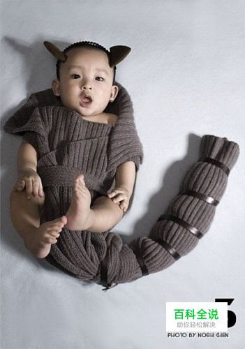 用妈妈的旧毛衣包住宝宝,把长出来的部分拧成条,在最后用皮带扎成尾巴的样子。头上最好再带上一个牛角发夹。