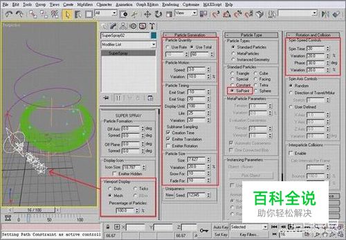 设定分子系统沿着路径移动的动画: 1.点选 Super Spray02,上方工具列选择 Animation----> Constraints ----> Path Constraint ,连结给之前的螺旋体路径。 2.成功后会发现 Super Spray02 自动依附在路径上了。 图11