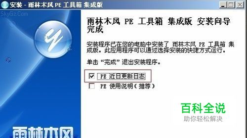 把“PE近日更新日志”的勾去除,选择“完成”。 按照以上操作,PE启动U盘制作完成。