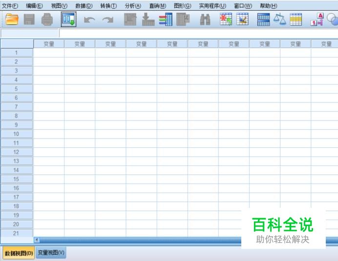 打开SPSS软件,当前为数据视图模式,还没有设定任何变量,所有变量设定都是在变量视图模式下进行的。