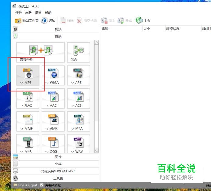 这里以格式工厂软件为例,打开格式工厂软件主页面,点击选择“音频-MP3”格式选项。