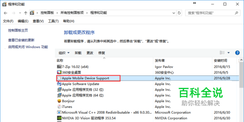 二、检查电脑是否安装 iTunes 或 苹果驱动 打开“控制面板-程序和功能”,查看是否已安装 iTunes 或 苹果驱动(Apple Mobile Device Support),若没有,请退出并重新打开爱思助手,根据提示安装 iTunes 或 苹果驱动。