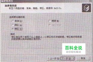步骤2:xp弹出【新建卷向导】对话框.在选择类型中选中【带区】单选按钮,然后单击【下—步】按钮,如图2所示