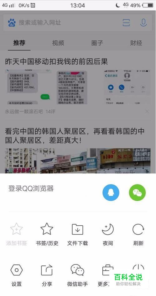 打开手机QQ浏览器,上滑打开菜单。此处我们能看到登录QQ浏览器的两种方法:QQ登录、微信登录。