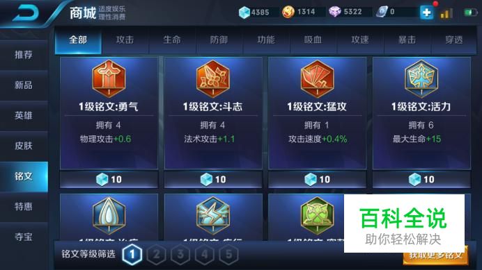 在商城的下方,我们可以选择铭文的等级,5级铭文是最高等级的铭文,每一个铭文需要1600铭文碎片,配齐5级铭文需要大量的铭文碎片。