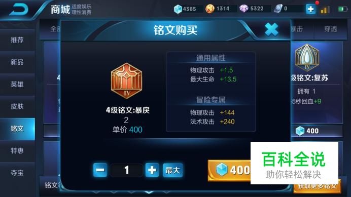 购买两套铭文需要消费钻石,因此我们只搭配一套通用铭文。 红色铭文选择“4级暴戾”,增加最大生命值和物理攻击,前期可以提高消耗能力。