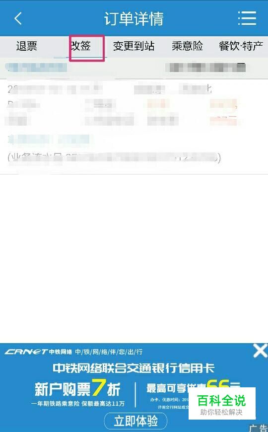 点开已购买的车票进入“订单详情页面”点击界面最上方的“改签”。