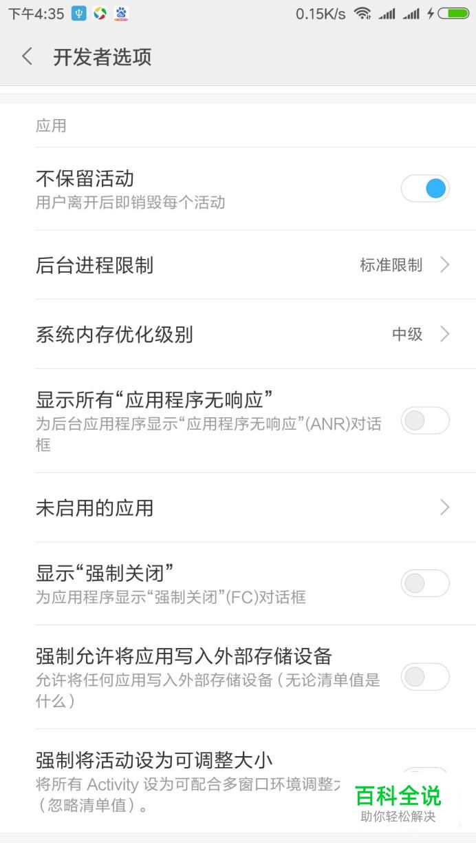下滑找到开发者选项点击进入,下滑开启不保留活动