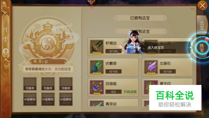 进入法宝界面,可以查看已拥有的法宝,没有获得法宝之前要进行获取,选择“炼宝”