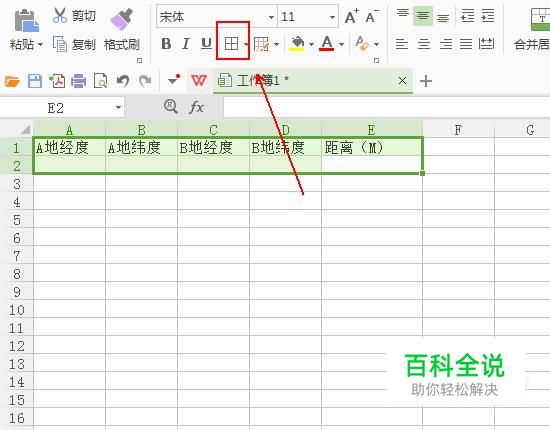 如图所示选中 A1-E2所有的单元格,对其进行框线的添加。